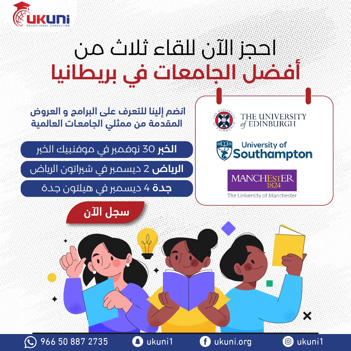 Join us to learn about the programs and offers presented by representatives of global universities. Meet with representatives from the Universities of Edinburgh, Manchester, and Southampton in person to learn about study programs and admission requirements.